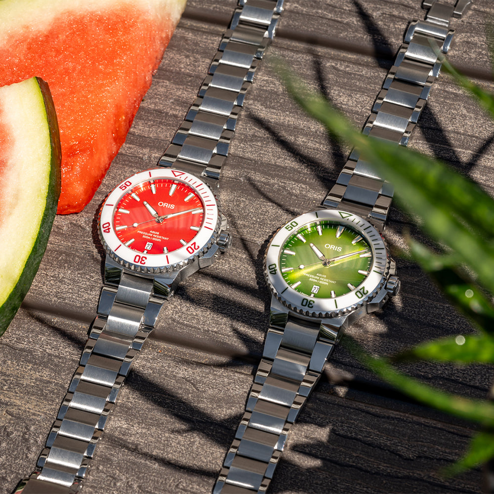 L’arrivée tant attendue de l’été en Suisse inspire la manufacture horlogère hôlsteinoise Oris, qui introduit deux nouvelles pièces bariolées dans sa collection Aquis Date. Baptisée « Taste of Summer », cette paire de montres porte en elle la gaieté des fruits de saison, invitant à l’aventure sous-marine avec ses teintes rappelant le vert d’un kiwi croquant et le rouge vibrant de la pastèque.